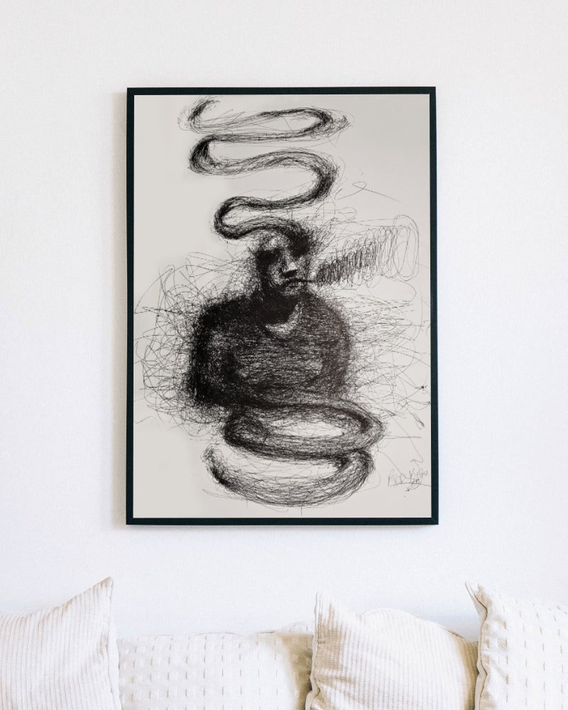 حيث تعكس الخطوط المتداخلة والمليئة بالارتباك حالة البحث عن الذات والوضوح في عالم مليء بالتفسيرات المغلوطة. هذه اللوحة هي دعوة للتفكير والتأمل في كيفية فهمنا للقلق والاكتئاب، وكيف يمكن أن نعيد النظر في معالجتها بعيدًا عن السحر والخرافات.