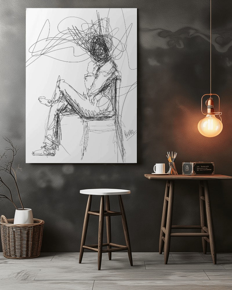 Delve into the complexity of human emotions with this compelling artwork. A figure captured in a moment of introspection and confusion, rendered in bold scribble style.